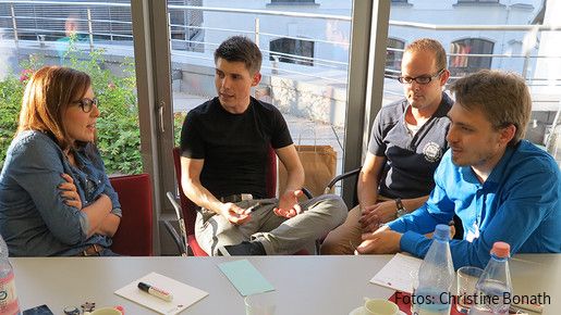 Gruppenarbeit beim „Bürgerdialog“: Die Chefin der dbb jugend Sandra Kothe (links) und Jugendvertreter aus dbb Fachgewerkschaften diskutierten am 18. Juli im dbb forum berlin, welche Werte wichtig sind, damit „Gut leben in Deutschland“ funktionieren kann.