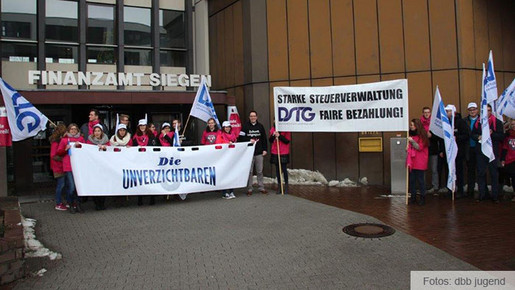 Dem Aufruf der Deutschen Steuer-Gewerkschaft (DSTG) und des dbb beamtenbund und tarifunion zur Demo vor dem Finanzamt Siegen folgten am 24. Februar 2015 auch viele Anwärterinnen und Anwärter. Für Jano Hillnhütter zeigt dies, dass die jungen Beschäftigten verstanden haben, dass es um ihre Zukunft geht. Die Unverzichtbaren, so lautet der Slogan der dbb jugend. Aber ohne vernünftige Bezahlung, so ist sich Jano Hillnhütter sicher, werden sich in Zukunft keine Unverzichtbaren mehr finden lassen. „Aus diesem Grund müssen die Arbeitgeber in der nächsten Verhandlungsrunde endlich ein vernünftiges Angebot auf den Tisch legen.“