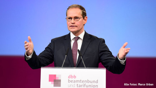 Die Bedeutung des öffentlichen Dienstes für die Gesellschaft betonte der Regierende Bürgermeister von Berlin und amtierende Bundesratspräsident Michael Müller. Notwendig sei ein neues Miteinander: „Die Bürger erwarten eine funktionierende Verwaltung. Die muss kein Kumpel sein, aber Nähe und Vertrauen sind heute unerlässlich. Die Bürger wollen mitentscheiden.“ Dafür müsste der öffentliche Dienst angemessen ausgestattet werden. Wichtig sei nicht nur mehr und fachlich qualifiziertes Personal, dieses müsse auch entsprechende soziale Kompetenzen mitbringen. „Ich würde mir wünschen, dass die Vielfalt der Berufe im öffentlichen Dienst noch bekannter wird, und wir so viele junge und engagierte Menschen für eine Karriere bei uns begeistern können“, so Müller.